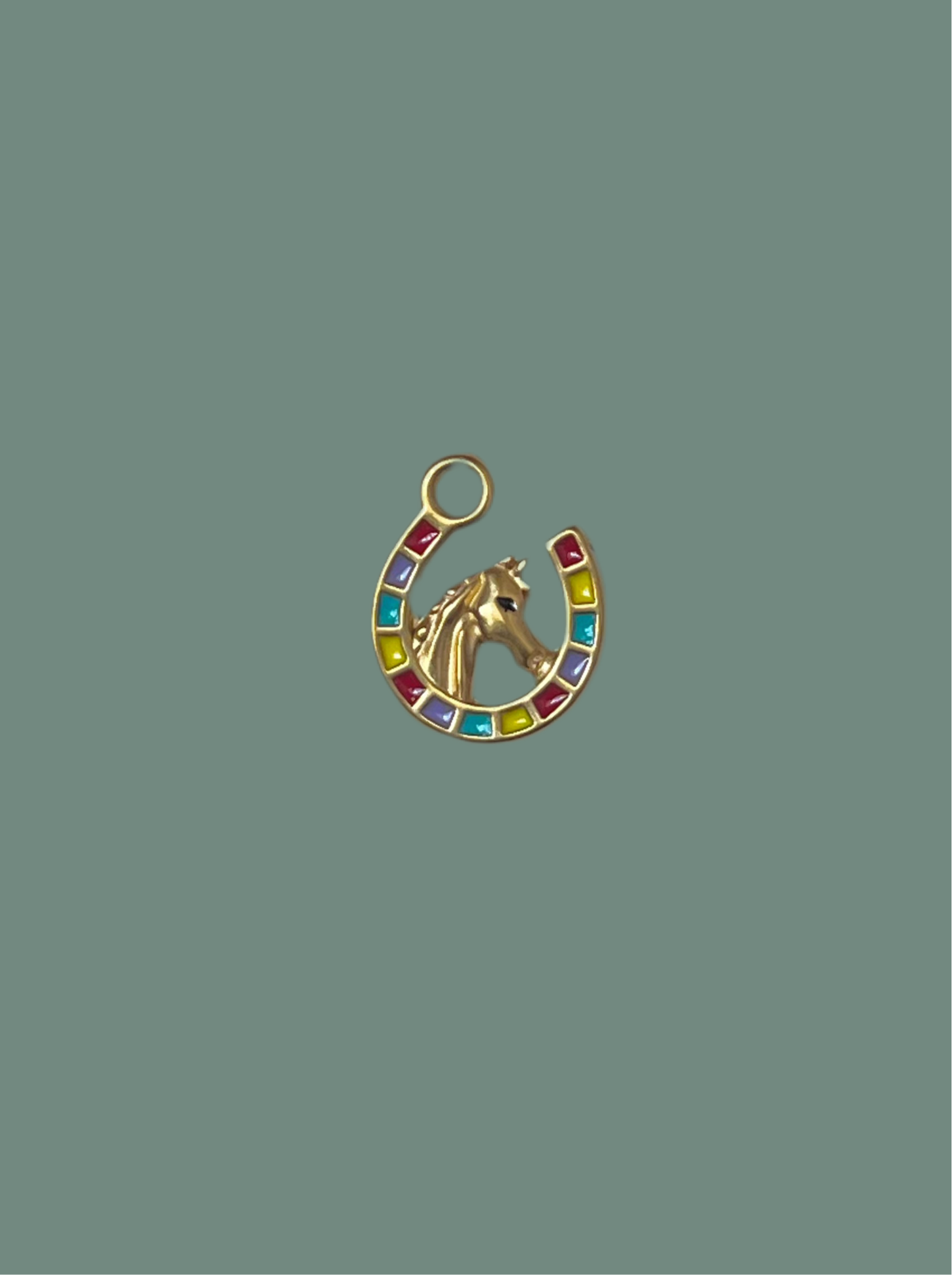 Meet Prismatic Pony, your new lucky charm. This golden horseshoe features a beautifully detailed horse head surrounded by sparkling rainbow gems — a perfect blend of timeless luck and playful color. Add it to your necklace or bracelet for a pop of magic and a touch of “lucky girl” energy. Tarnish‑free and totally enchanting.